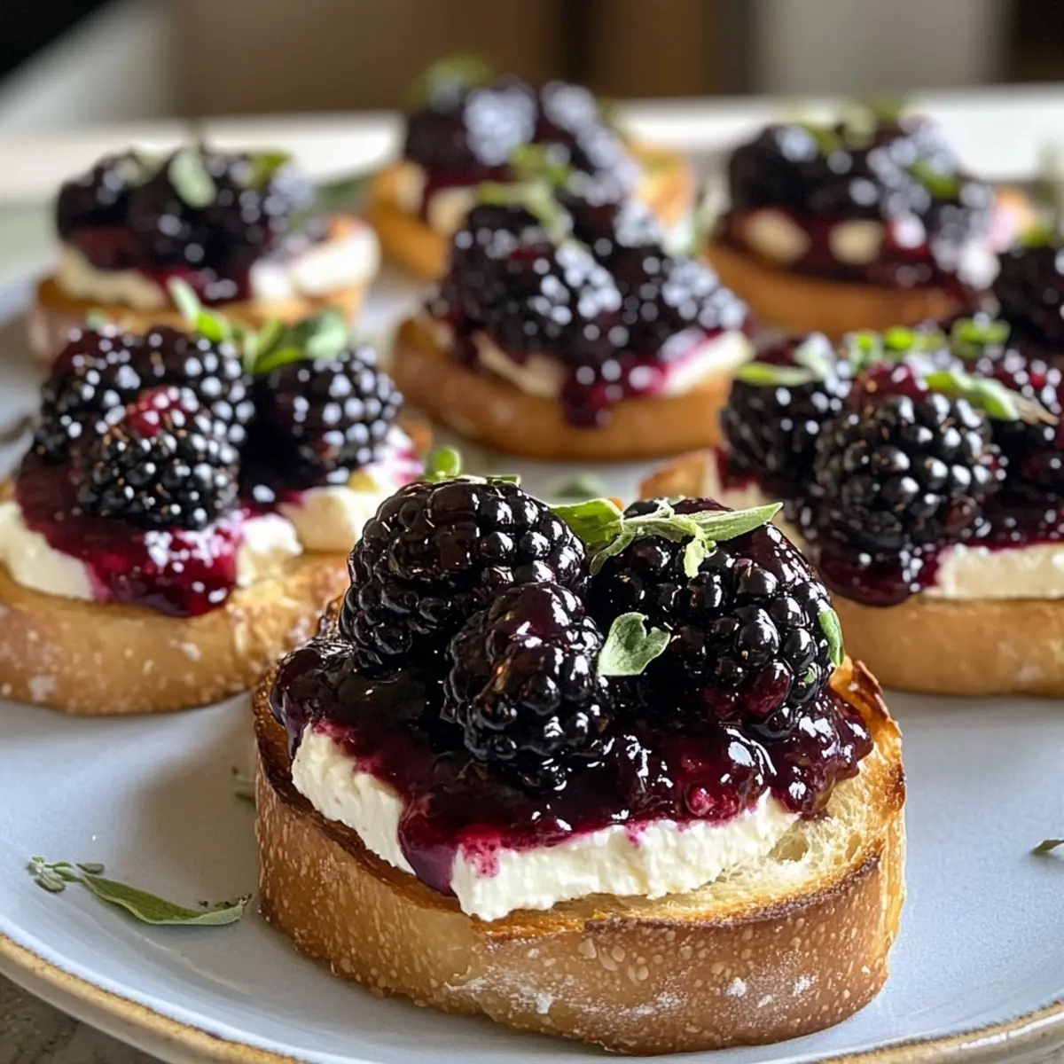 - Top each crostini with 2-3 blackberries, lightly crushing some.