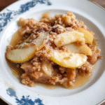 Spread the apple mixture evenly in a greased baking dish. Then sprinkle your oat topping generously over the apples—don’t be shy!