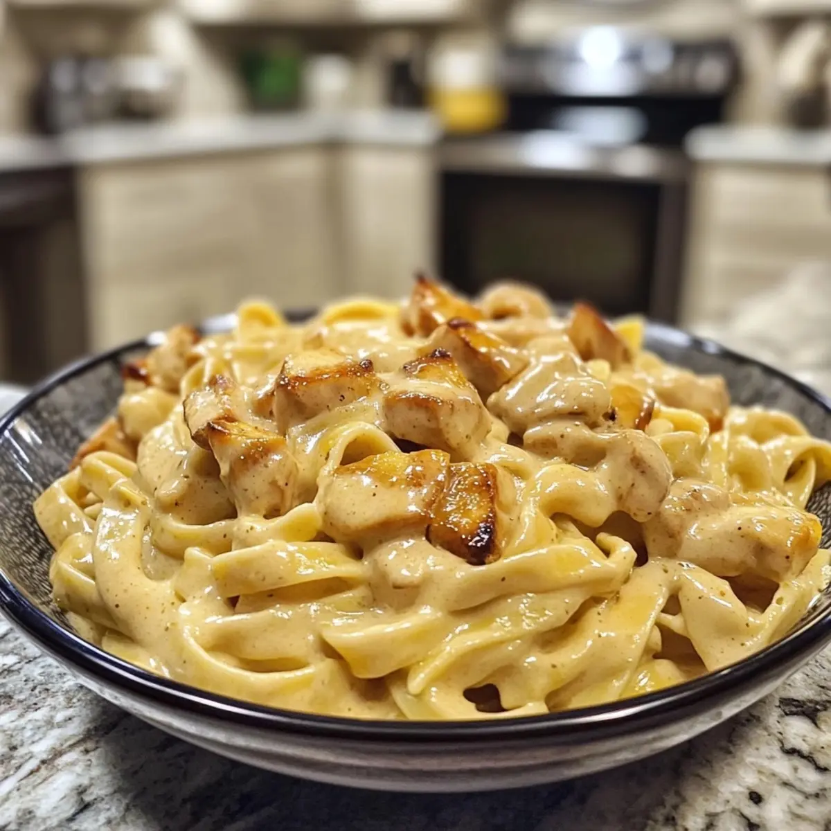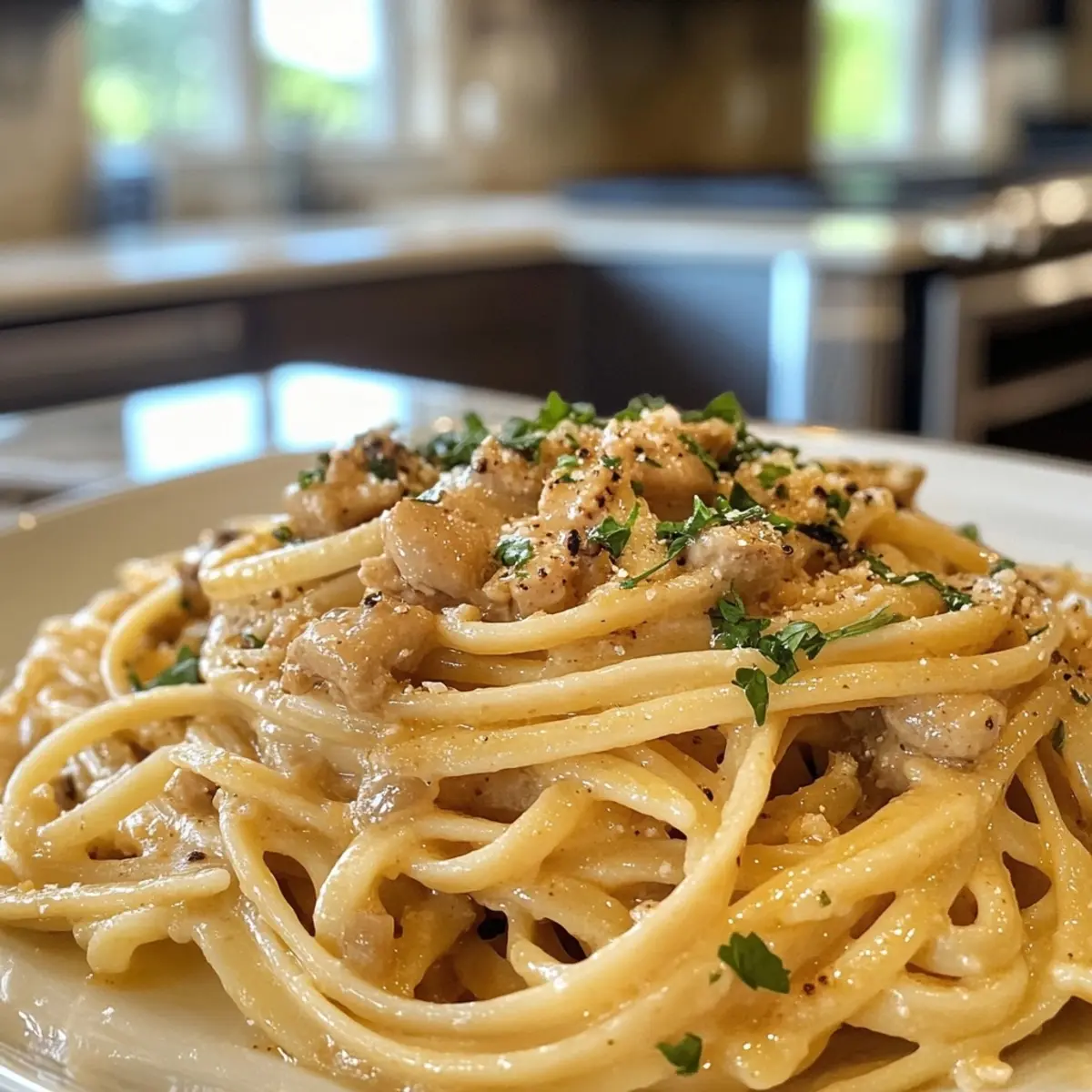 • Combine Ingredients: Stir in the grated Parmesan cheese until it melts. Add the cooked pasta and sautéed chicken, tossing until well coated.